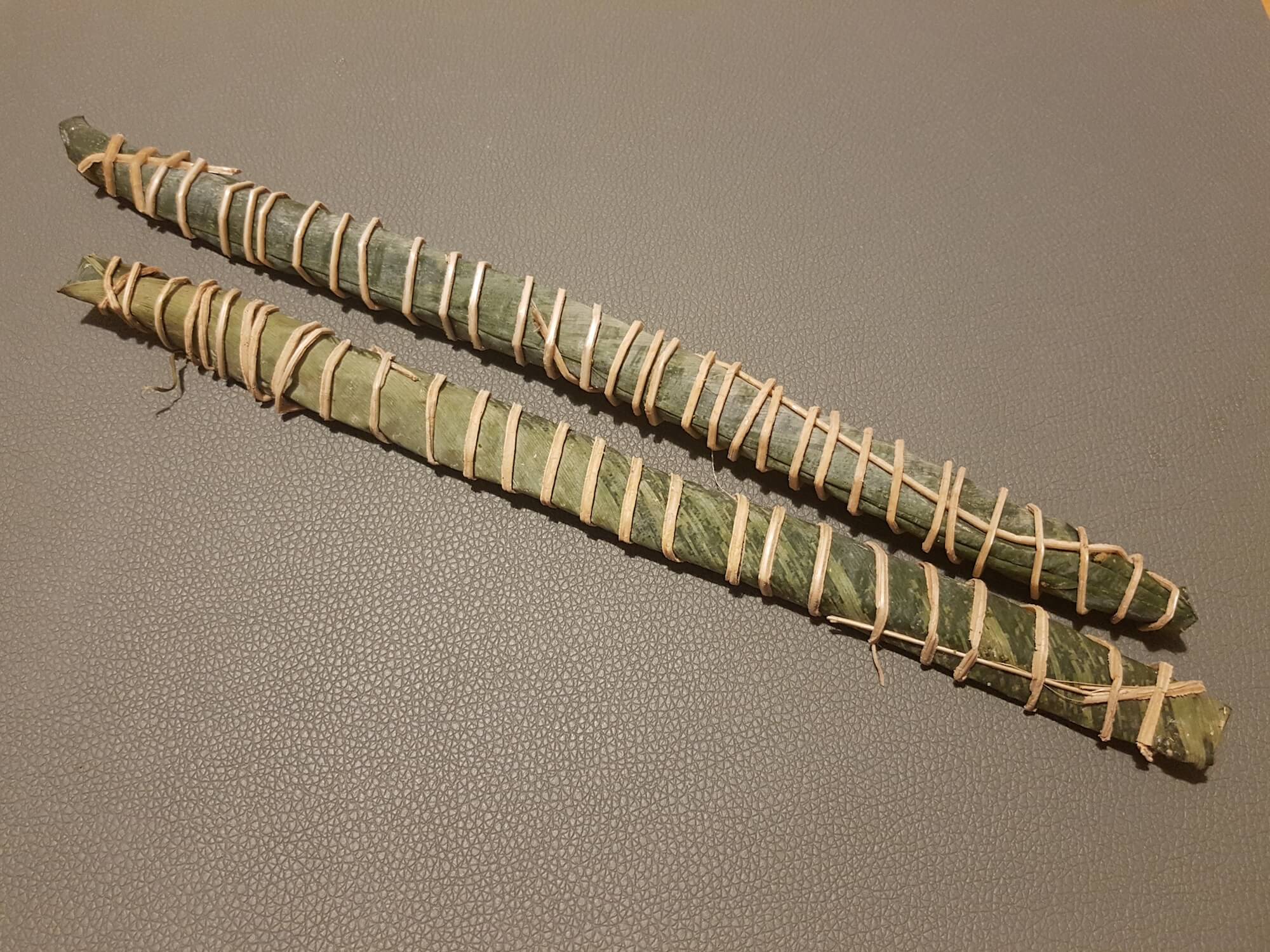 Miondo ist wie Bobolo ist eine traditionelle Beilage für afrikanische Gerichte. Miondo ist jedoch nicht zur Schnecke gerollt. Hier wird die Maniokstange nur in ein Bananenblatt gewickelt und bleibt dann eine Stange.